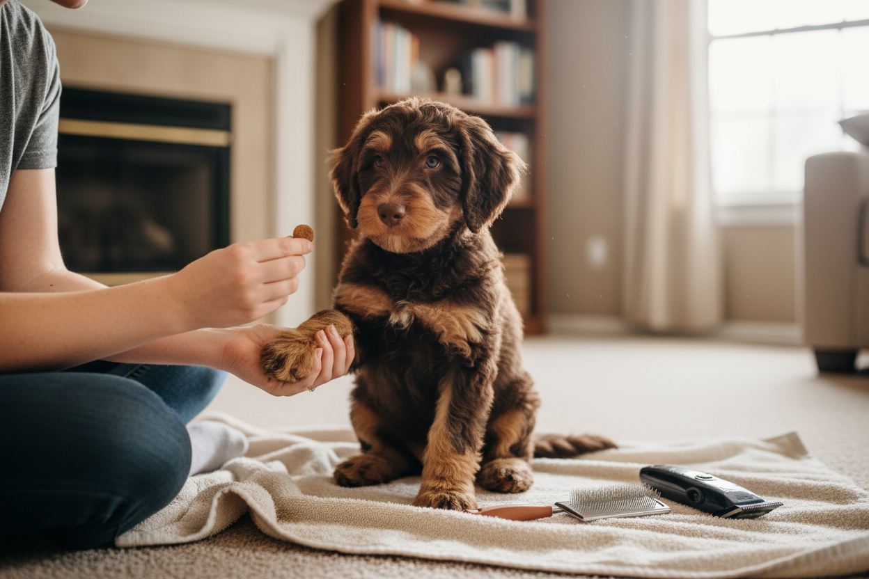 In Anderson, Australian Labradoodle puppies begin grooming desensitization at three weeks through Puppy Culture handling protocols. This page covers early nail trim exposure, brushing introduction, clipper sound conditioning, paw handling, and cooperative grooming behaviors. Puppies go home with positive grooming associations already established through gradual desensitization. Pre-started grooming training prevents groomer struggles and reduces lifetime grooming costs for Anderson families.