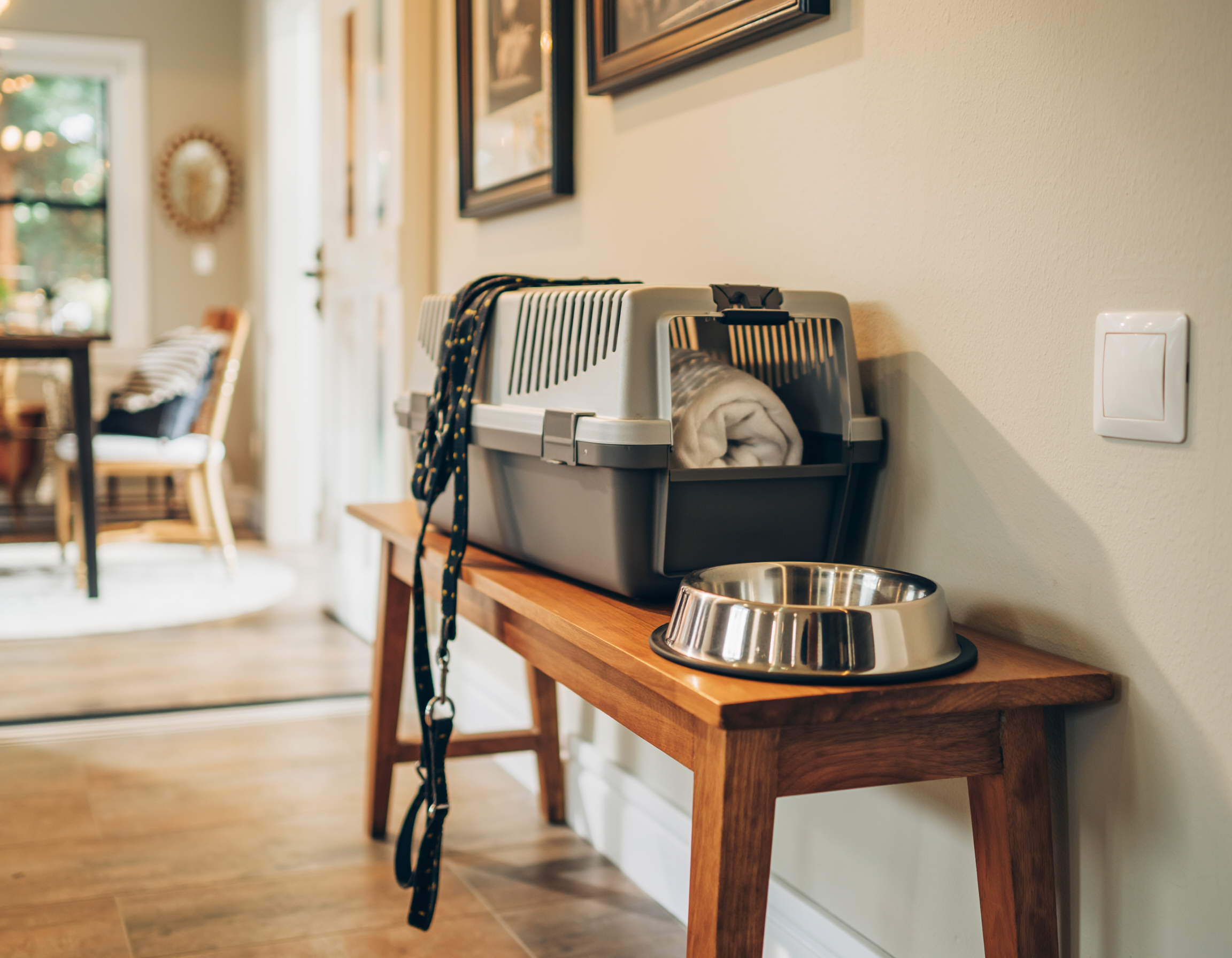 Bring your doodle's food, medications, leash, crate, and favorite toy. Familiar items help your pet feel at home right away. Your dog's crate provides typical sleeping quarters that reduce anxiety in a new space.
